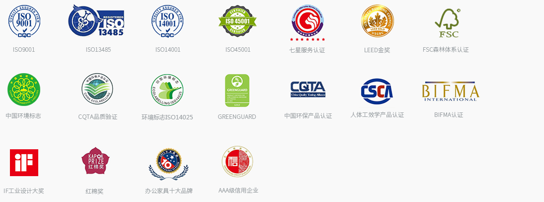 产品通过中国环境标志产品认证、CQC中国环保产品认证、人类工效学产品认证、环境国际标准认证、GREENGUARD认证、CQTA品质验证、BIFMA认证等;